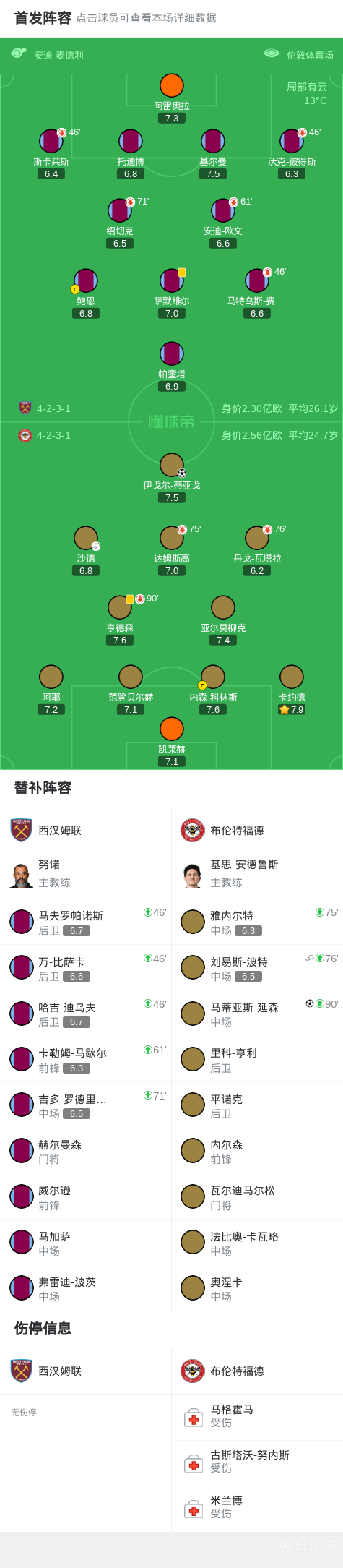 布伦特福德2-0西汉姆联,蒂亚戈破门,延森建功